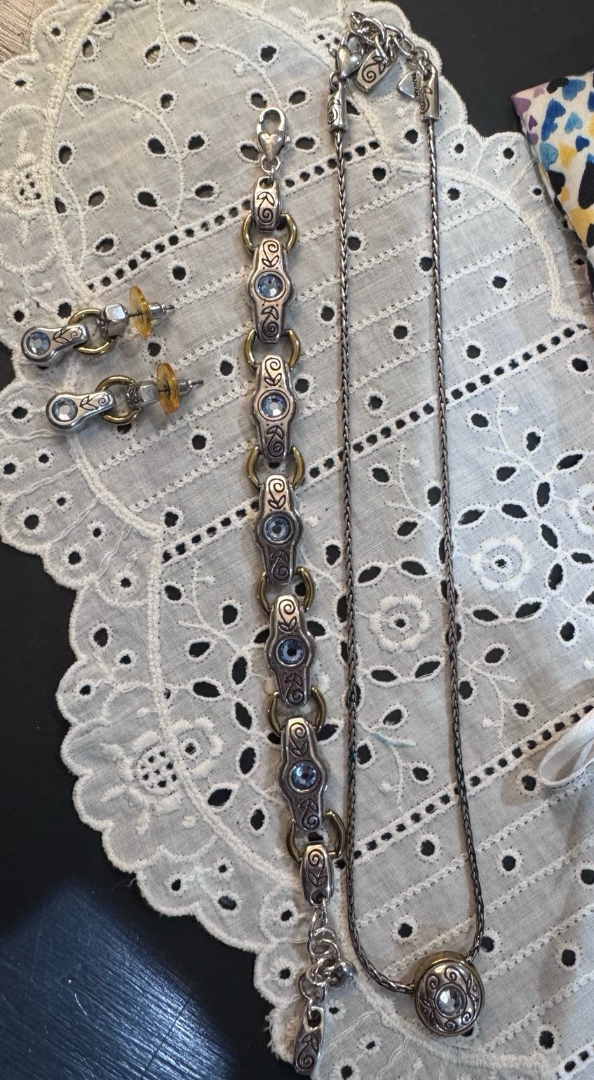 Brighton Celestial or Celestine two-tone (silver and brass) link bracelet with necklace and earrings featuring blue crystals or rhinestone