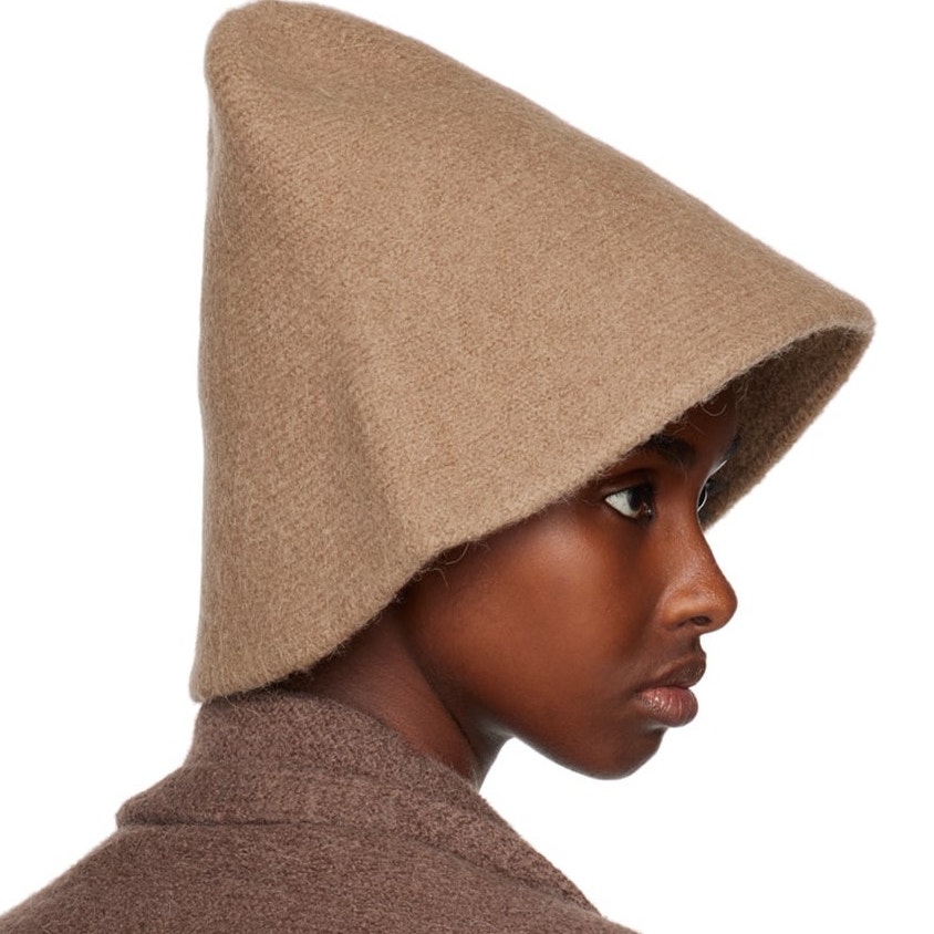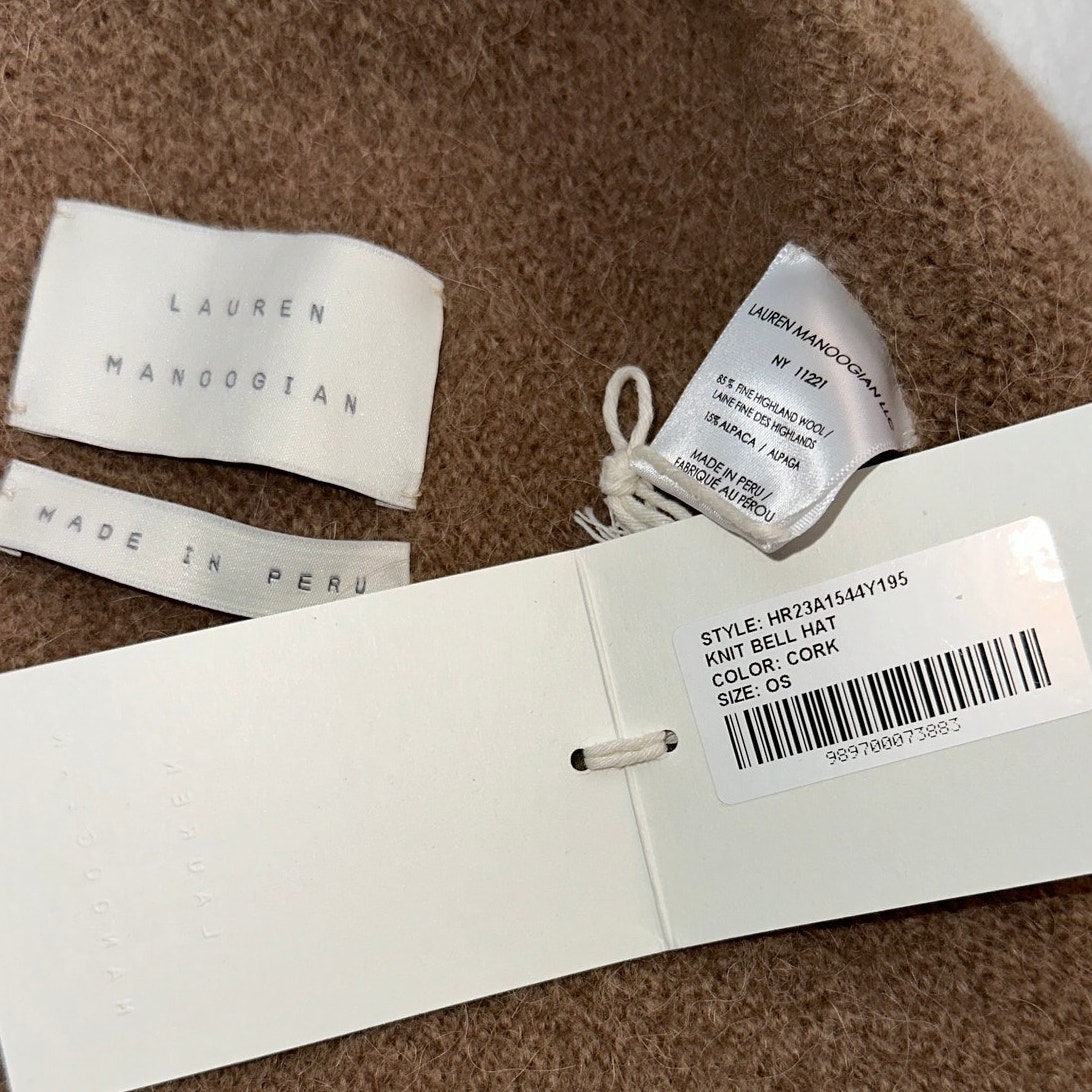 Lauren Manoogian's Bell Hat has a stunning shape and is hand loomed in Peru using a soft felted highland wool blend. This sculptural hat features seamless construction and can be worn with the brim both up or down. One size fits most. Unlined. Brand new and unworn with original retail hang tags. 85% fine highland wool / 15% alpaca. Spot clean. Color is "Cork", a warm camel color (best represented in the outdoor pics on the hanger in the mid-day sun).