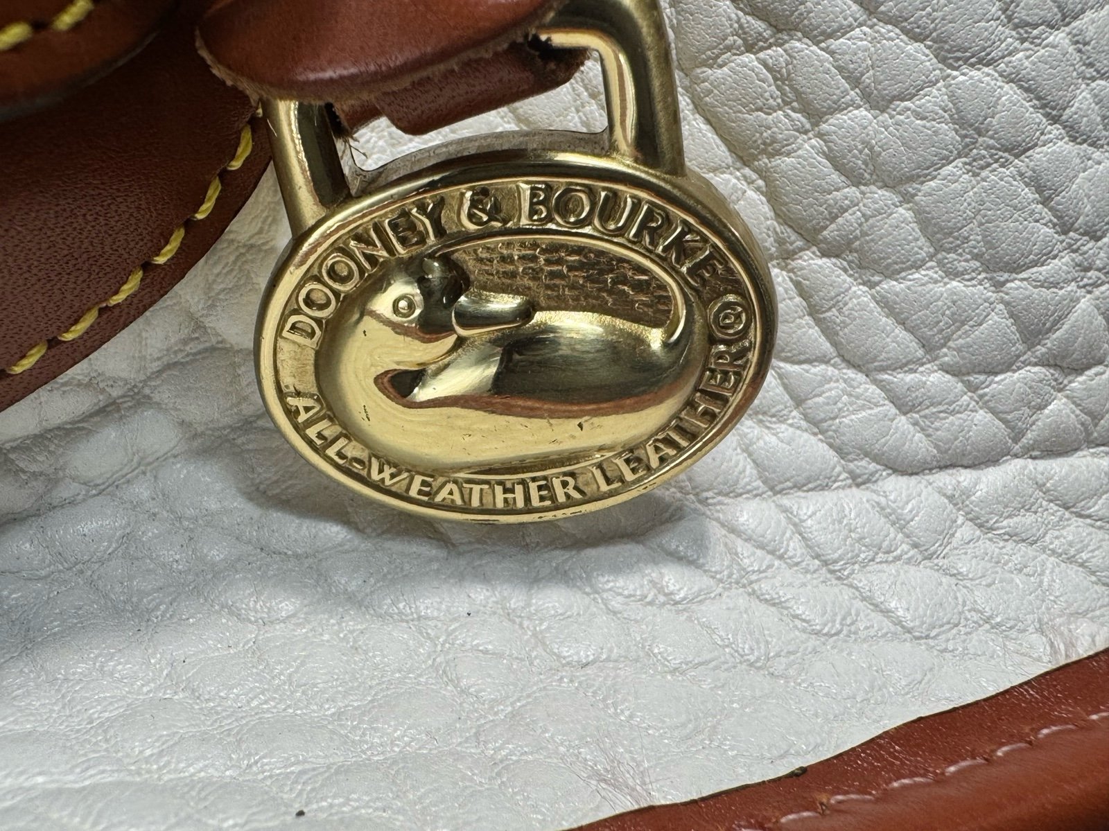 The Vintage DOONEY & BOURKE Tan & Cream Pebbled Leather Crossbody Purse Bag exudes a classic and timeless style. Crafted in the USA with pebbled leather in a brown and white cream color scheme, this medium-sized purse features a zip and buckle closure, gold and brass hardware accents, and an adjustable crossbody strap for easy wear. The bag also includes a charming buckle accent and is lined with leather in a brown color. This authentic Dooney & Bourke piece is perfect for women looking for a retro accessory that combines quality craftsmanship with a touch of nostalgia. The bag comes with the leather strap for a crossbody look.